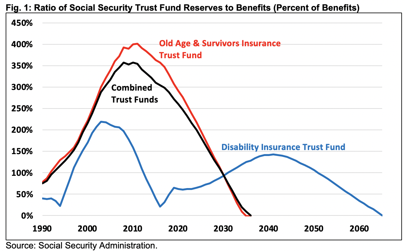 They project the Old-Age & Survivors Insurance (OASI) trust fund will deplete its reserves by 2034, while the Social Security Disability Insurance (SSDI) trust fund is projected to be exhausted by 2065. On a theoretical combined basis – assuming revenue is reallocated between the funds in the years between OASI and SSDI insolvency – Social Security will become insolvent by 2035.